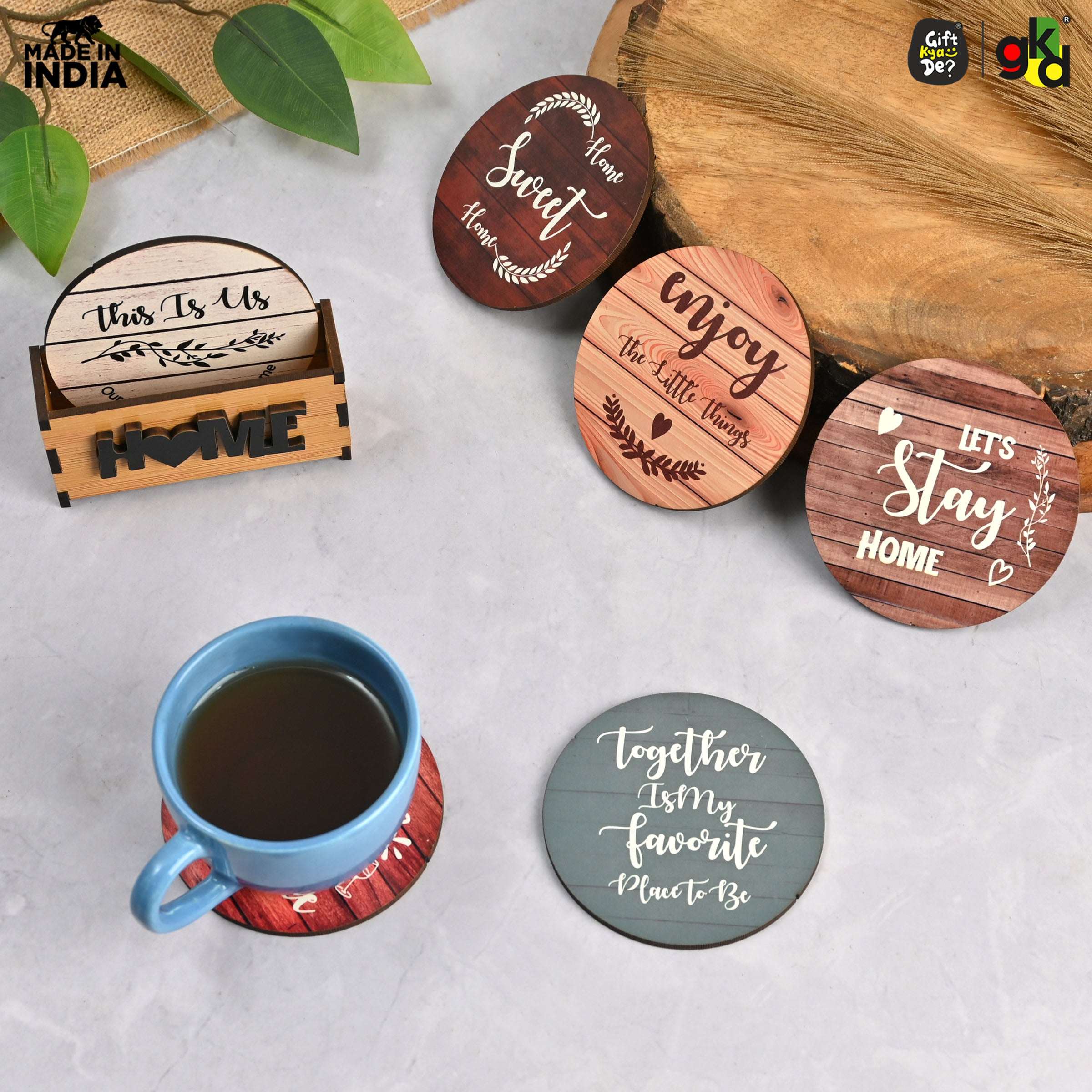 Home Quotes Wooden Coaster Set Of 6 With Stand – Perfect for Tea & Coffee Mugs