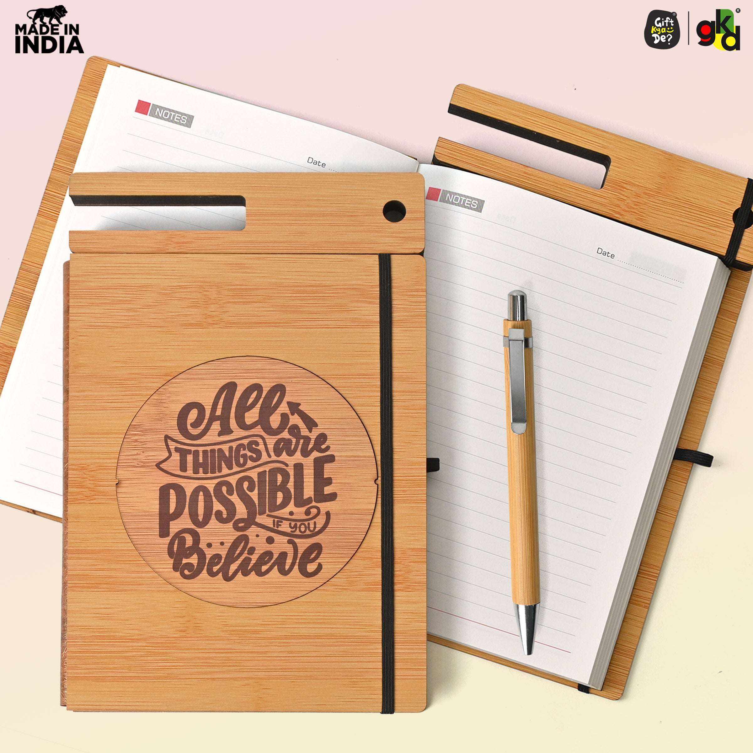 Crafted with a sustainable bamboo cover, this eco-friendly notebook is lightweight, durable, and stylish. It features a built-in mobile stand and pen holder, making it perfect for professionals and students alike. The included premium bamboo pen ensures a smooth writing experience.