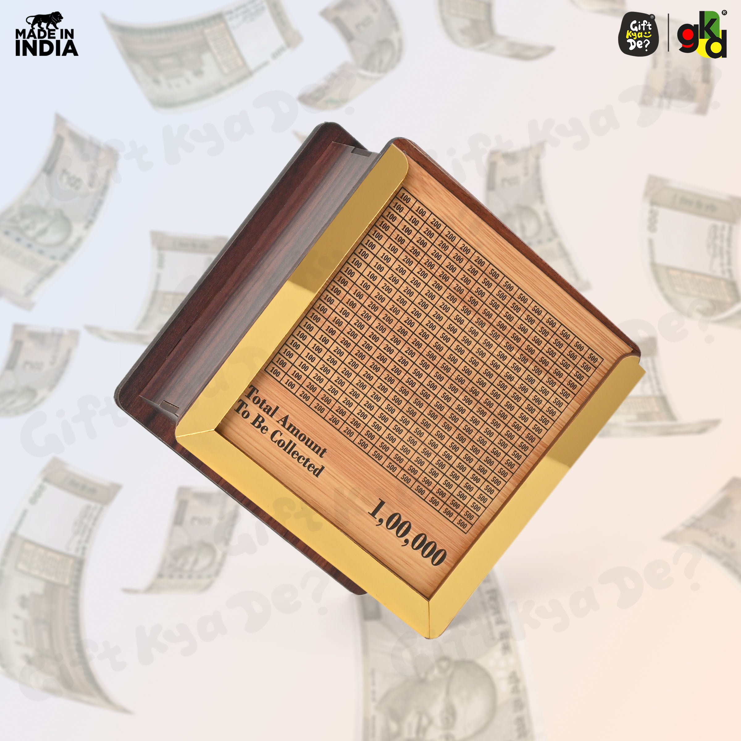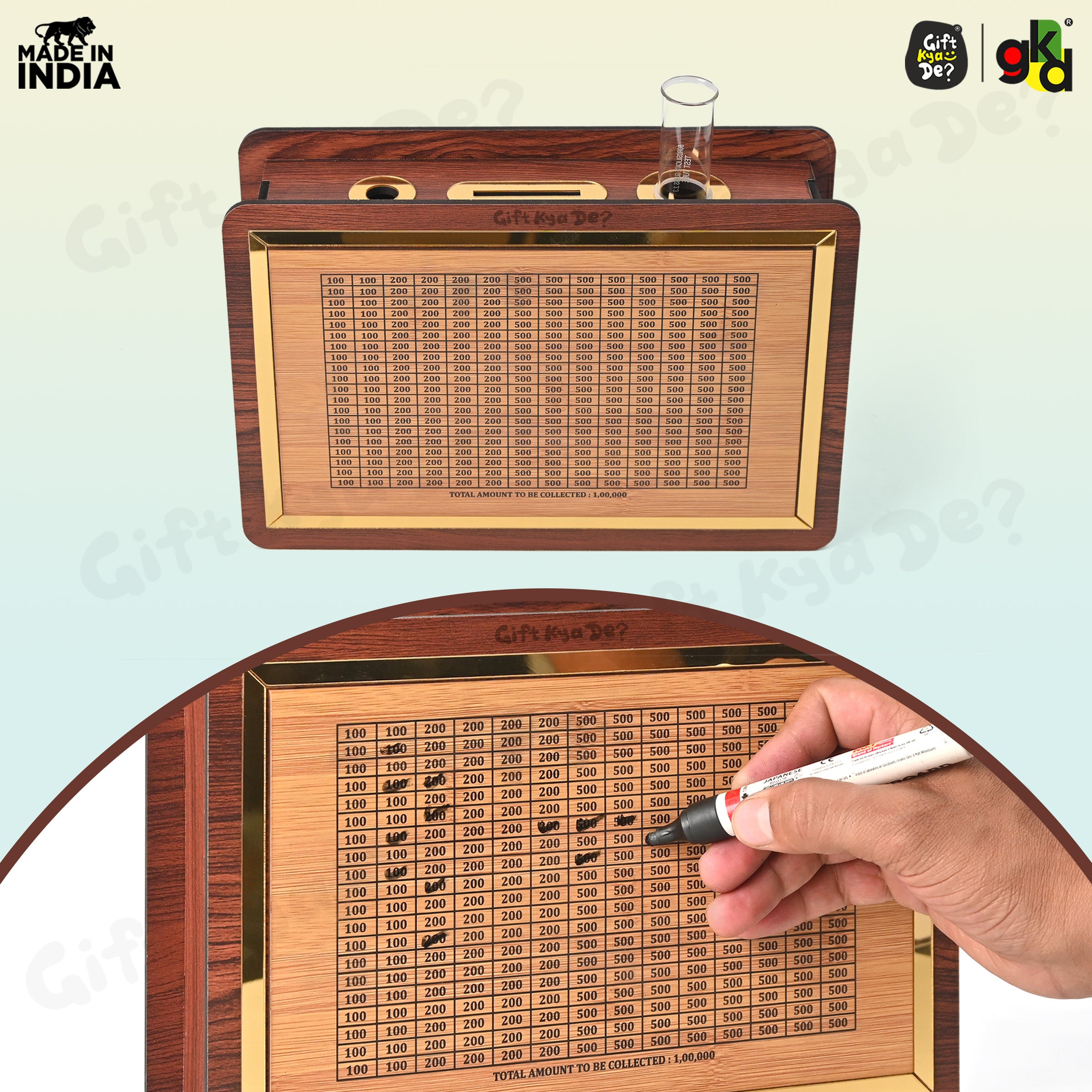 Introducing the Gift Kya De Wooden Piggy Bank, a creative and interactive way to track savings! Designed with pre-marked denominations like โน50, โน100, โน500, this unique wooden money bank allows you to cut off the amounts as you insert cash, making it a goal-oriented saving experience. The total savings goal is set at โน1,00,000โan exciting challenge for kids and adults alike.