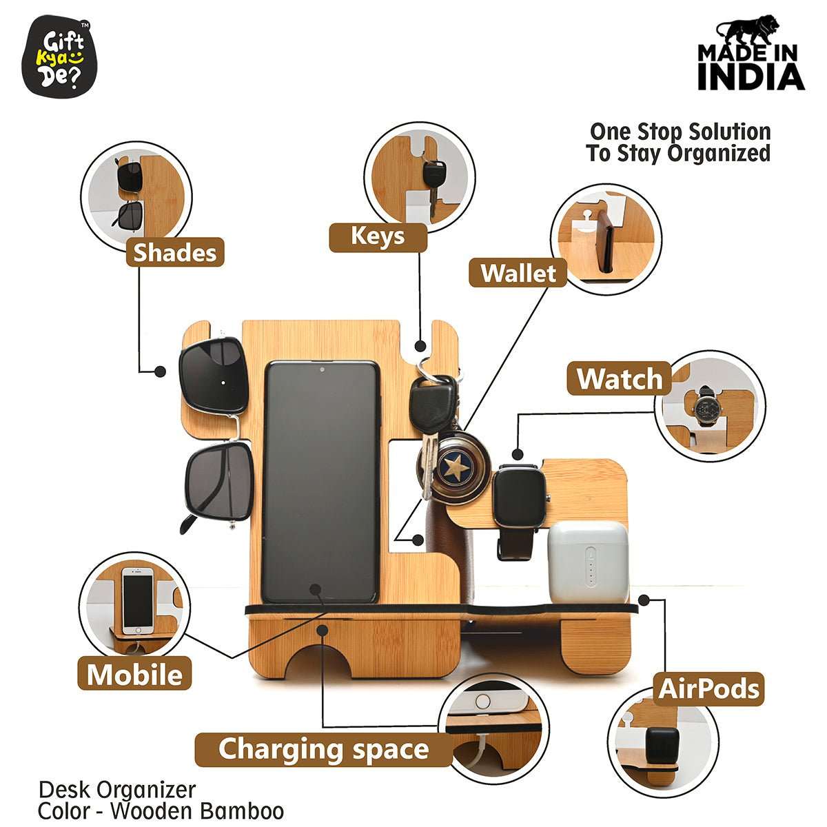 Our wooden 5 in 1 accessory organizer features a tray for mobile, a U- shaped cutout for key chains, sunglasses, a watch holder and a small space for a wallet.