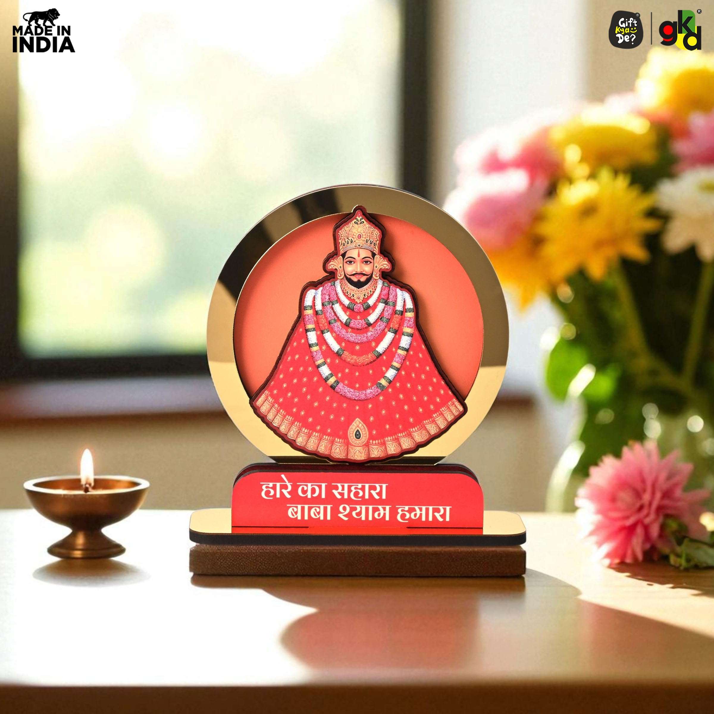 - Spiritual Desk Showpiece – Beautiful Khatu Shyam Ji idol with the sacred quote “हारे का सहारा बाबा श्याम हमारा”, ideal for pooja rooms, work desks, or gifting.