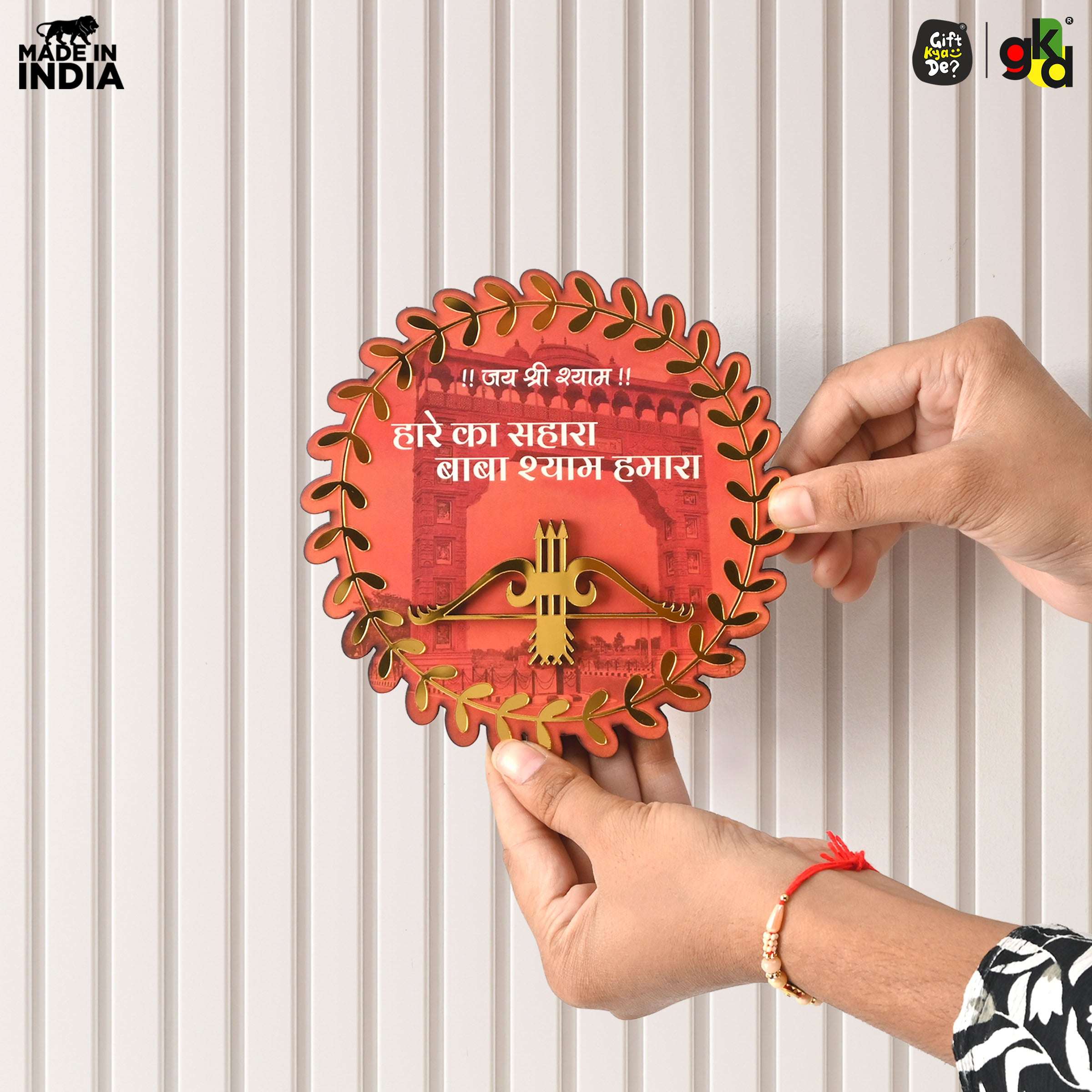 - Divine Khatu Shyam Ji Design – Beautifully crafted round wooden frame with “!! जय श्री श्याम !! हारे का सहारा बाबा श्याम हमारा” inscription, bringing positivity and devotion.