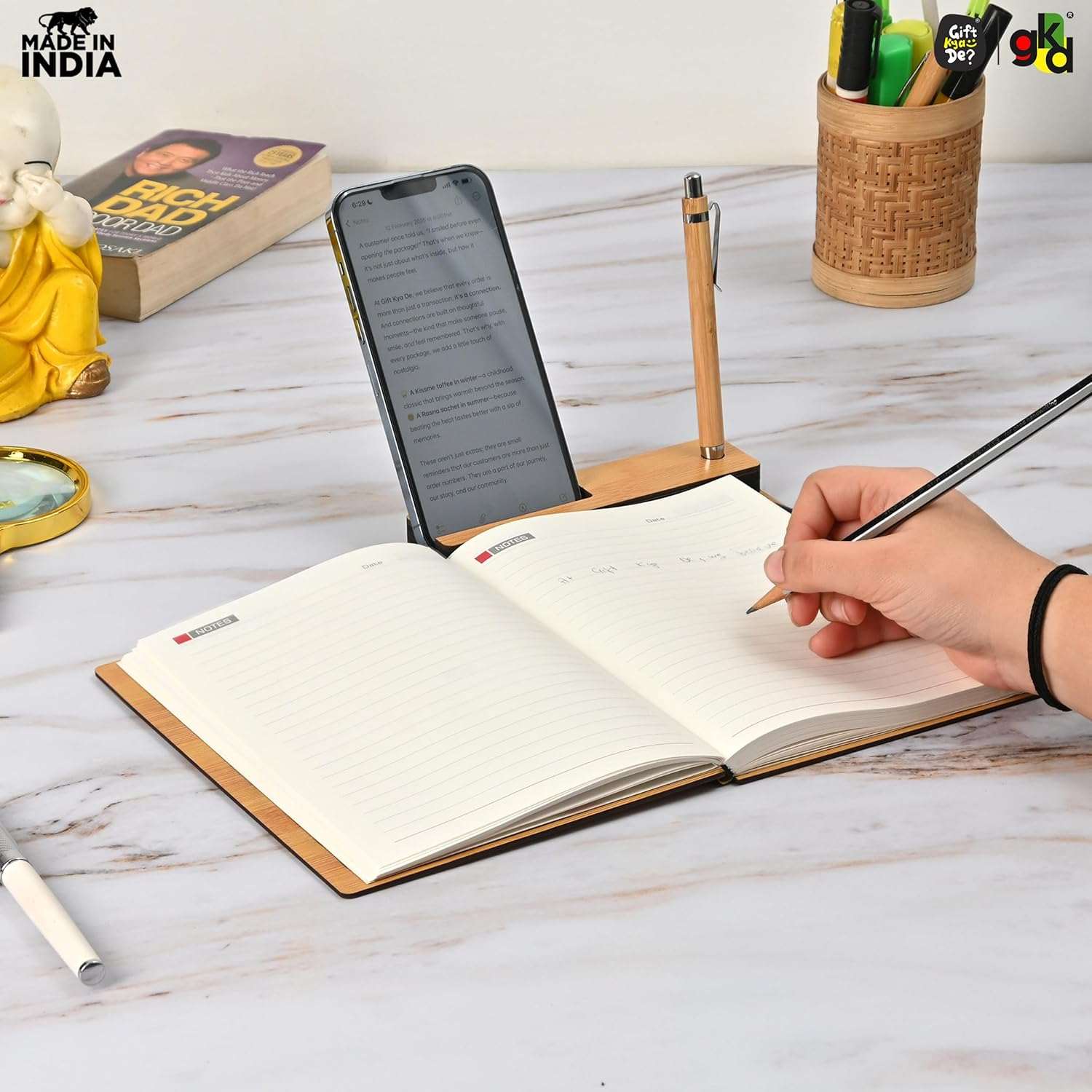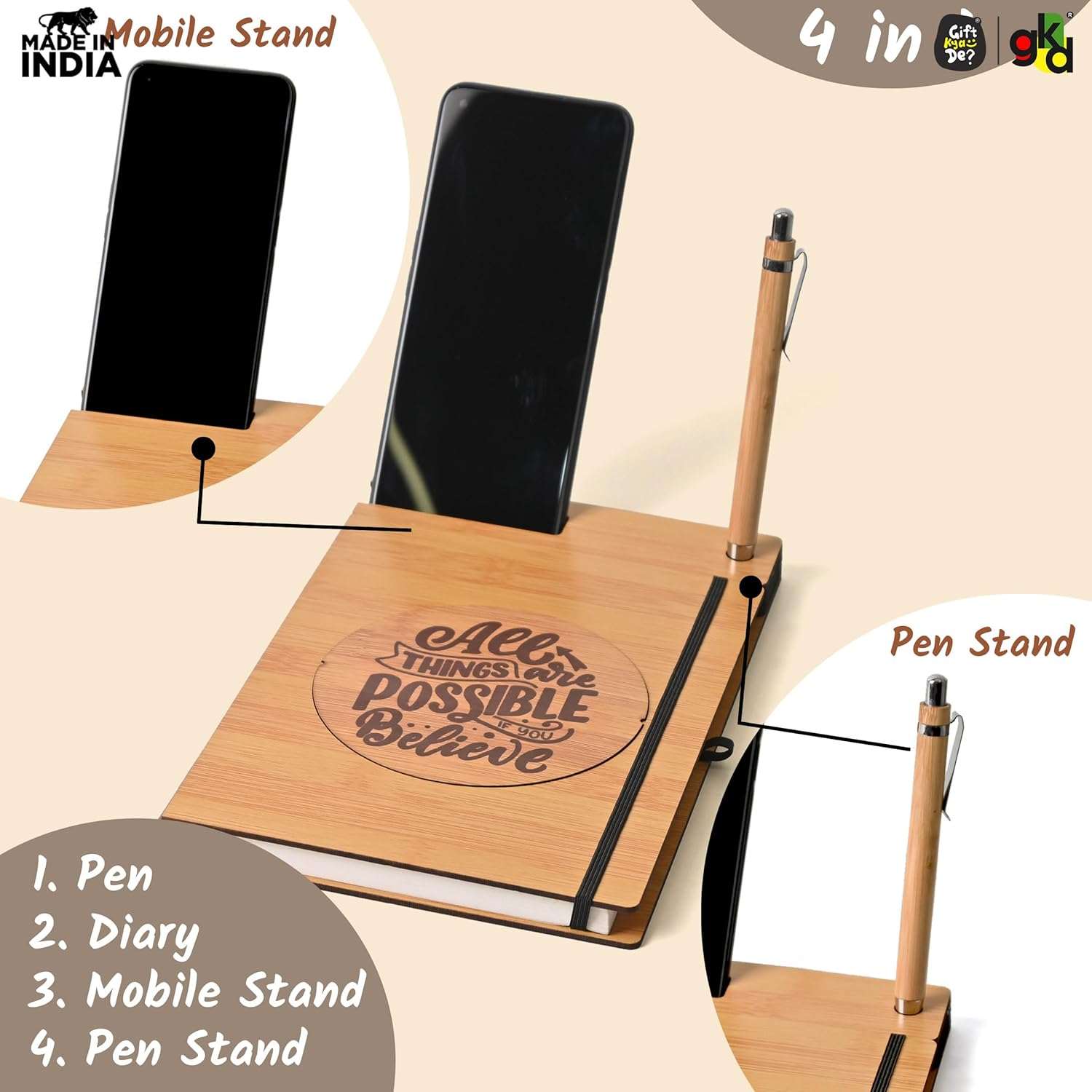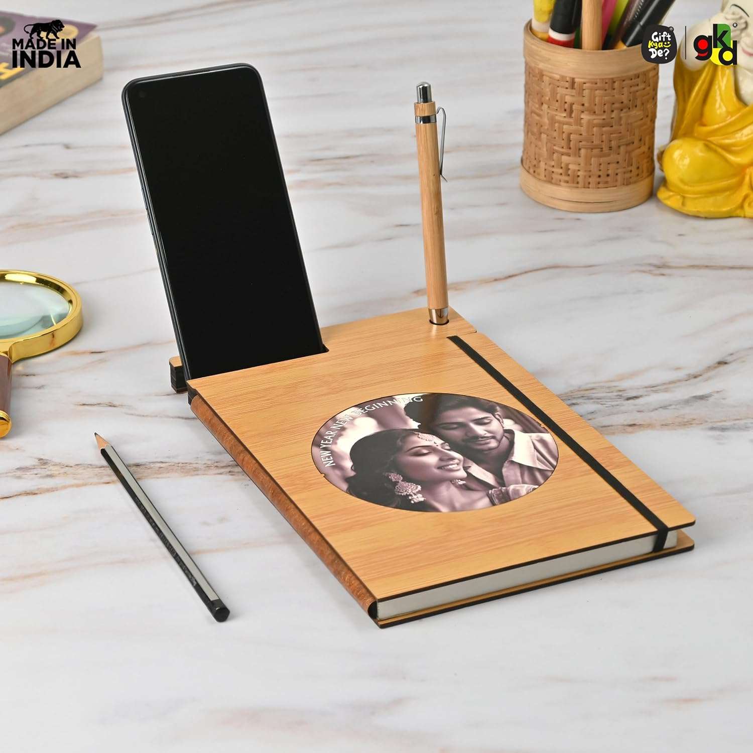 Enhance your workspace with the GKD Wooden Diary with Mobile & Pen Stand, available in two premium variations.